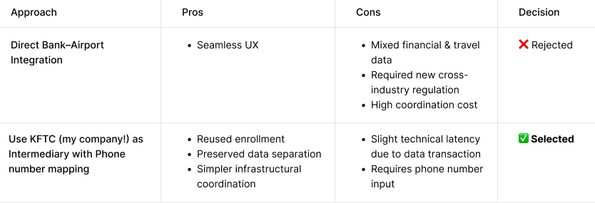 Banks were already connected to KFTC by financial compliance regulation, and KFTC only stored half of the biometric data with an unidentifiable customer ID, not full financial identity. By placing KFTC between banks and airports as a limited intermediary,